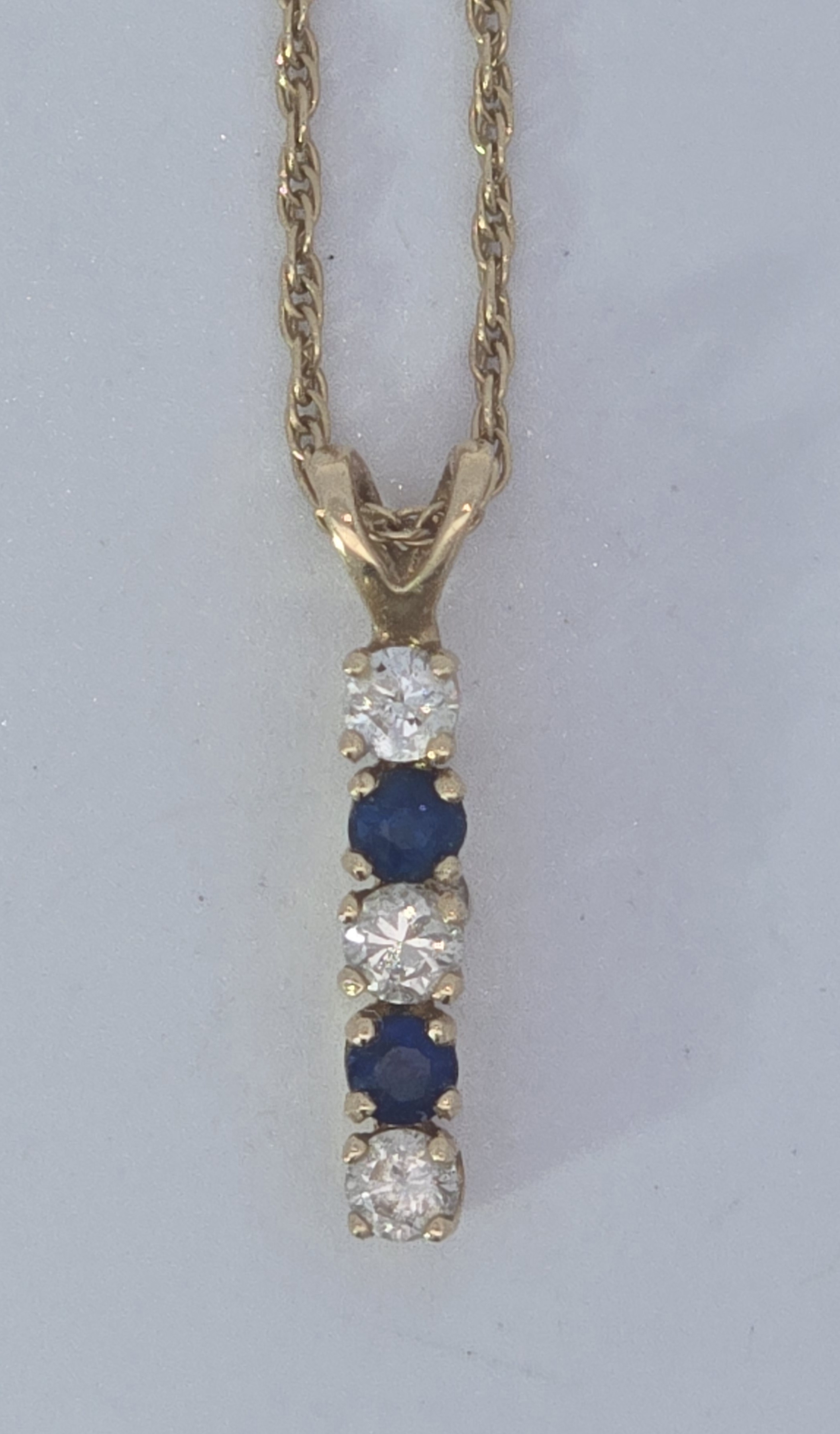 (978) 256-9796Estate 14K Yellow Gold Diamond And Sapphire Bar Pendant 16 Inches Long Total Weight Is 1.4 Gram